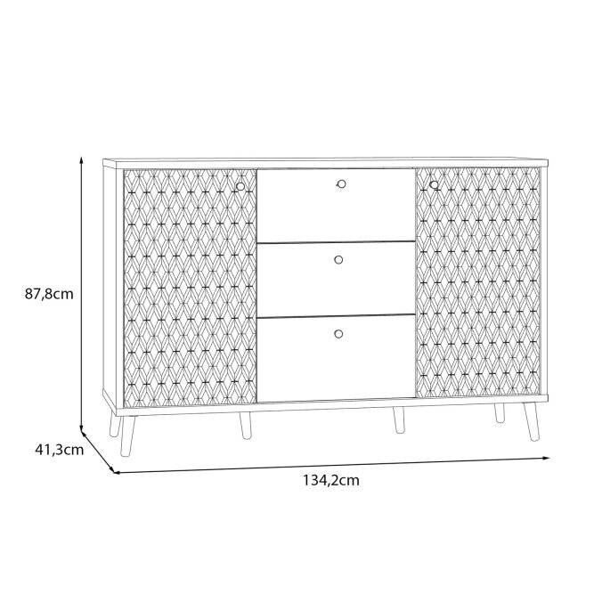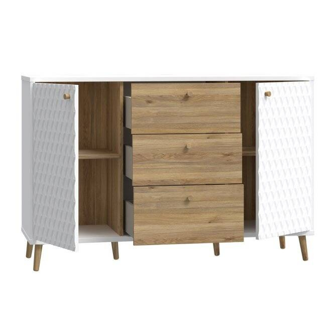Elegancka komoda do salonu z ryflowanymi frontami z kolekcji AKSANA to połączenie stylu i funkcjonalności. Wyposażona w 3 pojemne szuflady osadzone na prowadnicach z pełnym wysuwem oraz 2 szafki z wyjątkowymi, strukturalnymi frontami. Wysokie nóżki dodają jej lekkości i ułatwiają utrzymanie porządku pod meblem.