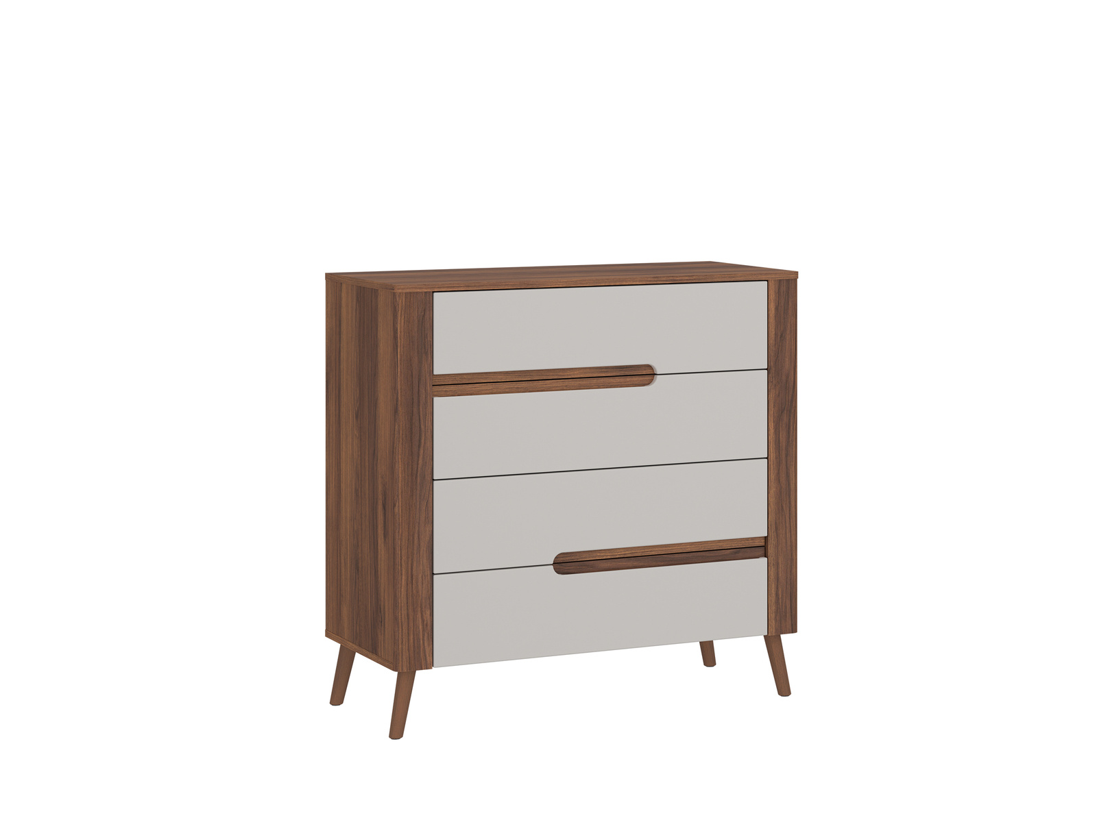 Komoda AMARILLO czteroszufladowa jest meblem, łączącym zalety pojemności przechowywania z unikalnym, nowoczesnym, a zarazem ponadczasowym designem. Wykonana z płyty wiórowej laminowanej i płyty MDF komoda osadzona została na efektownych, wysokich drewnianych nóżkach, a jej aplikacje, umieszczone asymetrycznie zachwycają w zestawieniu z bezuchwytowym systemem szuflad. Komoda, wyposażona w prowadnice kulkowe zapewnia swobodę i komfort użytkowania pełnego wysuwu szuflad.
