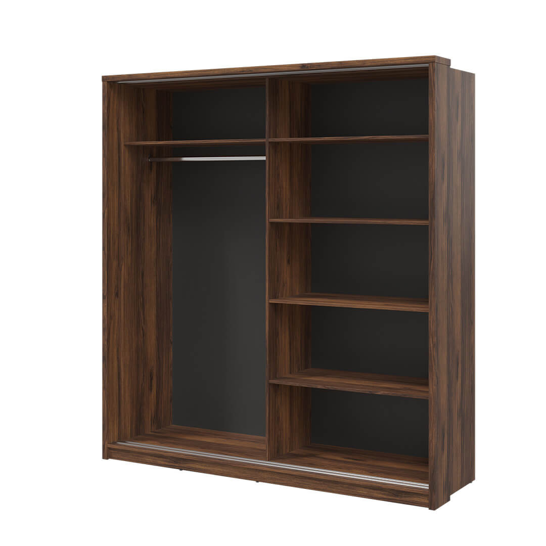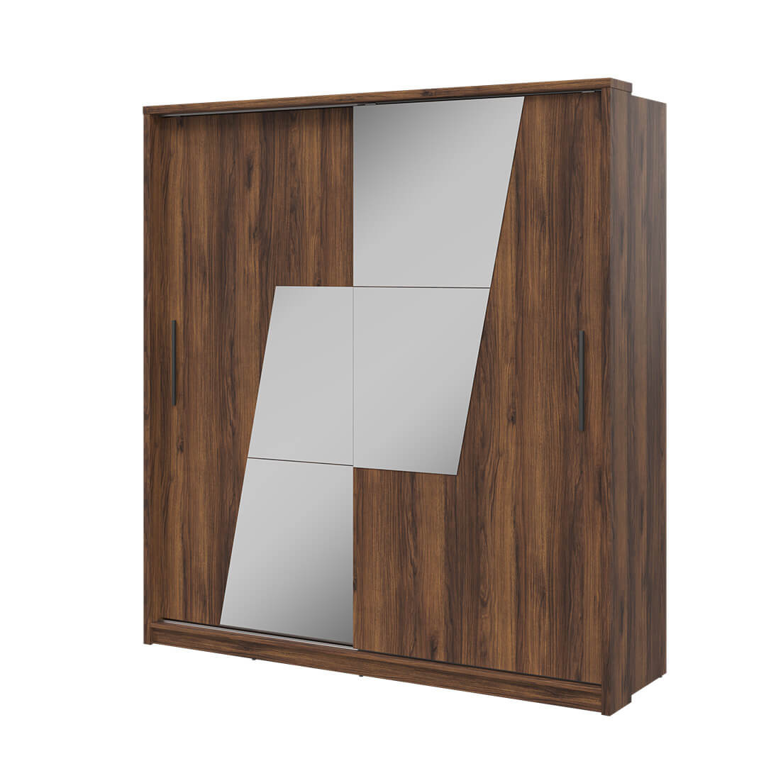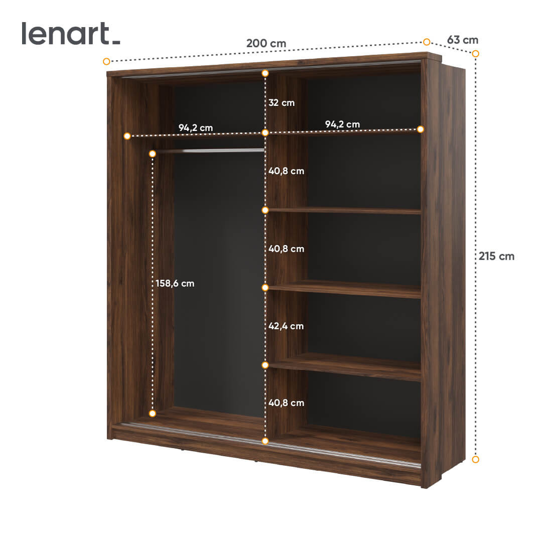 Szafa 200 cm z lustrem i przesuwnymi drzwiami posiada wiele pojemnych półek oraz drążek na ubrania co pozwala na dobre zorganizowanie przechowywanych w niej rzeczy. Przesuwne drzwi ułatwiają dostęp do jej zawartości, a jednocześnie pozwalają na oszczędność miejsca. Szafa została stworzona z wysokiej jakości materiałów, co gwarantuje trwałość i wytrzymałość mebla na lata.