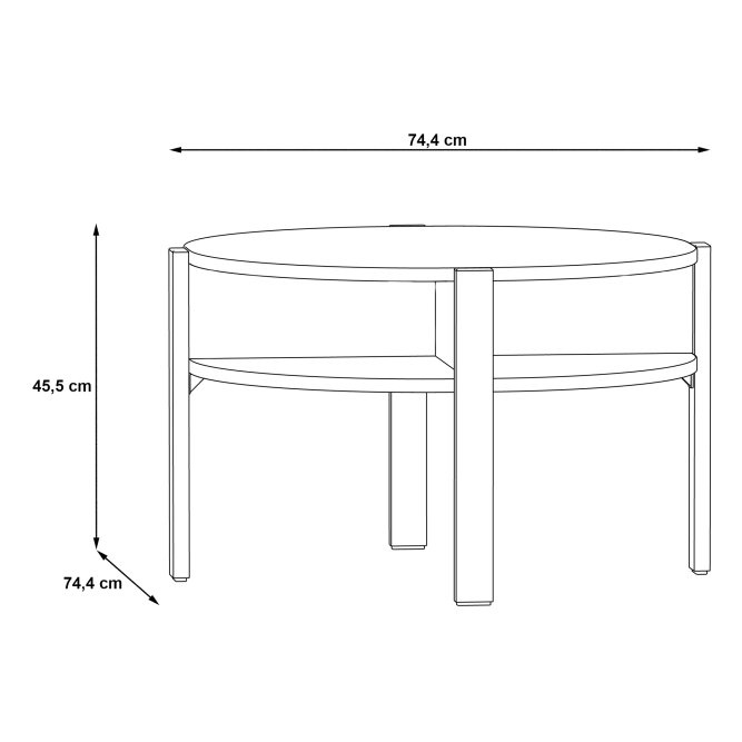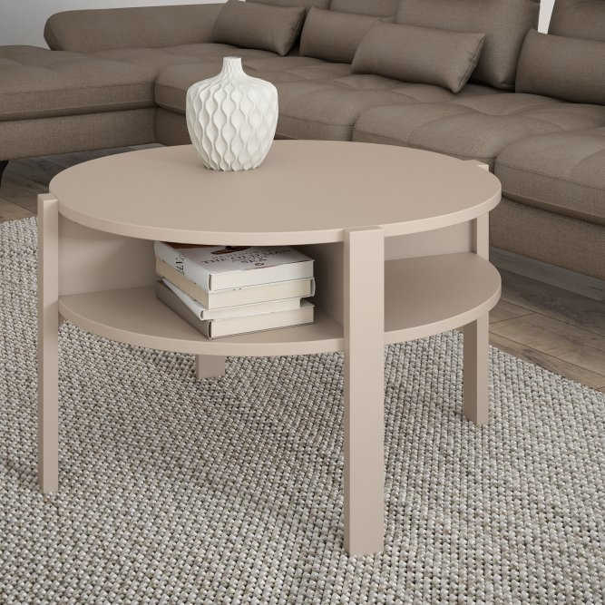 Okrągły stolik kawowy to doskonały wybór do nowoczesnego salonu. Modna forma i kolorystyka, pasująca do innych elementów kolekcji, podkreśla elegancki design mebla wpisuje się w najnowsze trendy aranżacyjne! Praktyczna półka pod blatem to świetne miejsce na odłożenie aktualnie czytanej książki lub pilotów do sprzętu RTV.