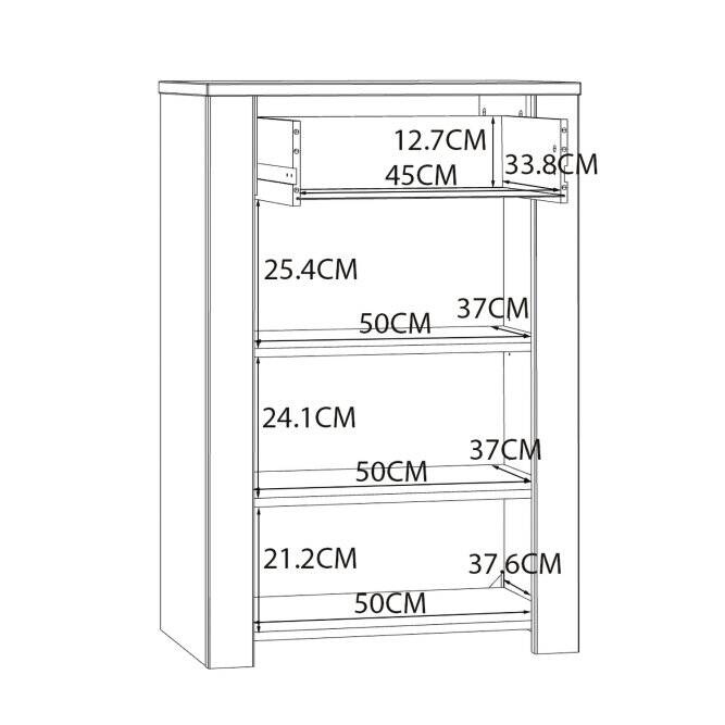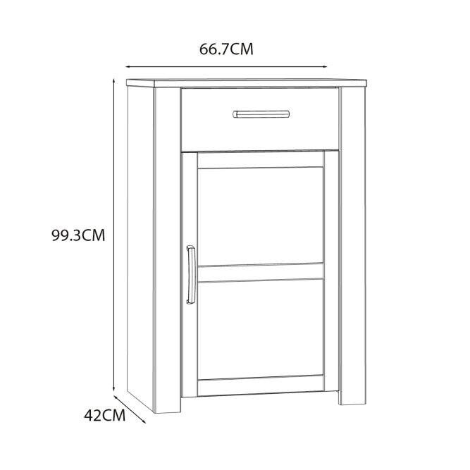 - Mebel o wymiarach 66,7 cm szerokości, 99,3 cm wysokości oraz 42 cm głębokości