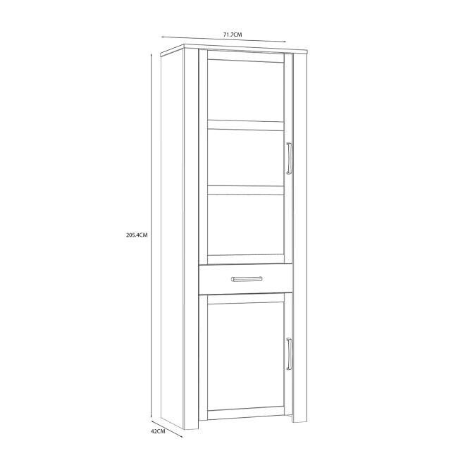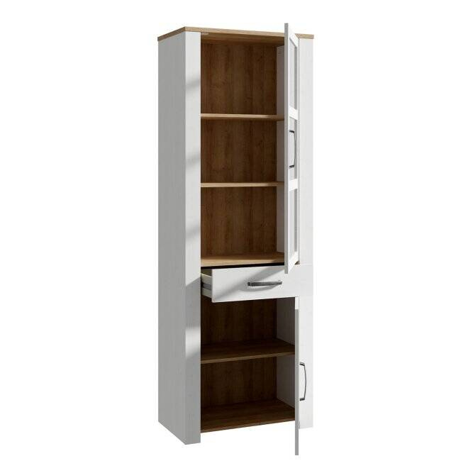 Witryna świetnie wyeksponuje Twoje ulubione książki, pamiątki oraz dekoracje. Pomogą w tym 3 regulowane półki. W przechowywaniu drobiazgów lub dokumentów sprawdzi się szuflada osadzona na prowadnicach kulkowych. 2-drzwiowa witryna doskonale wygląda zestawiona z pozostałymi elementami z kolekcji, tworząc wymarzoną aranżację salonu.