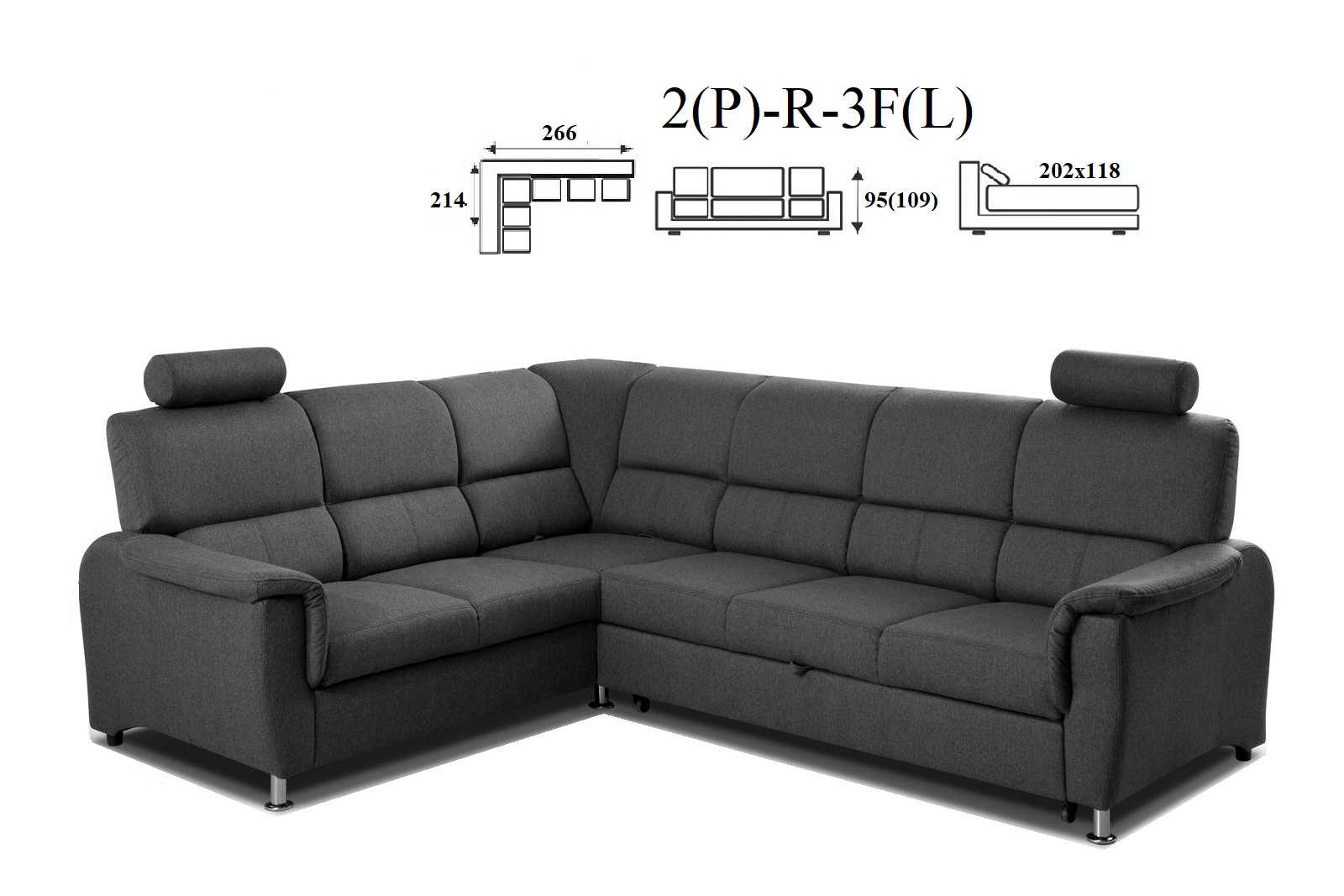 Narożnik z funkcją spania i pojemnikiem na pościel, wykonany na sprężynie falistej. Posiada funkcję relax oraz zagłówki i chromowane elementy ozdobne. Fotel z pojemnikiem