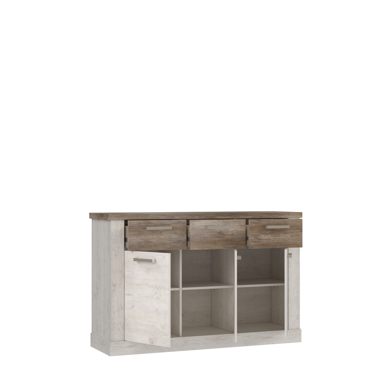 Połączenie dwóch kontrastujących, jasnych dekorów pozwoli na dopasowanie komody do każdej aranżacji wnętrz. Doskonale sprawdzi się zarówno w jadalni, sypialni oraz salonie. Subtelny dekor odwzorowujący naturalne usłojenie drewna ociepli wnętrze i nada pomieszczeniu eleganckiego charakteru.