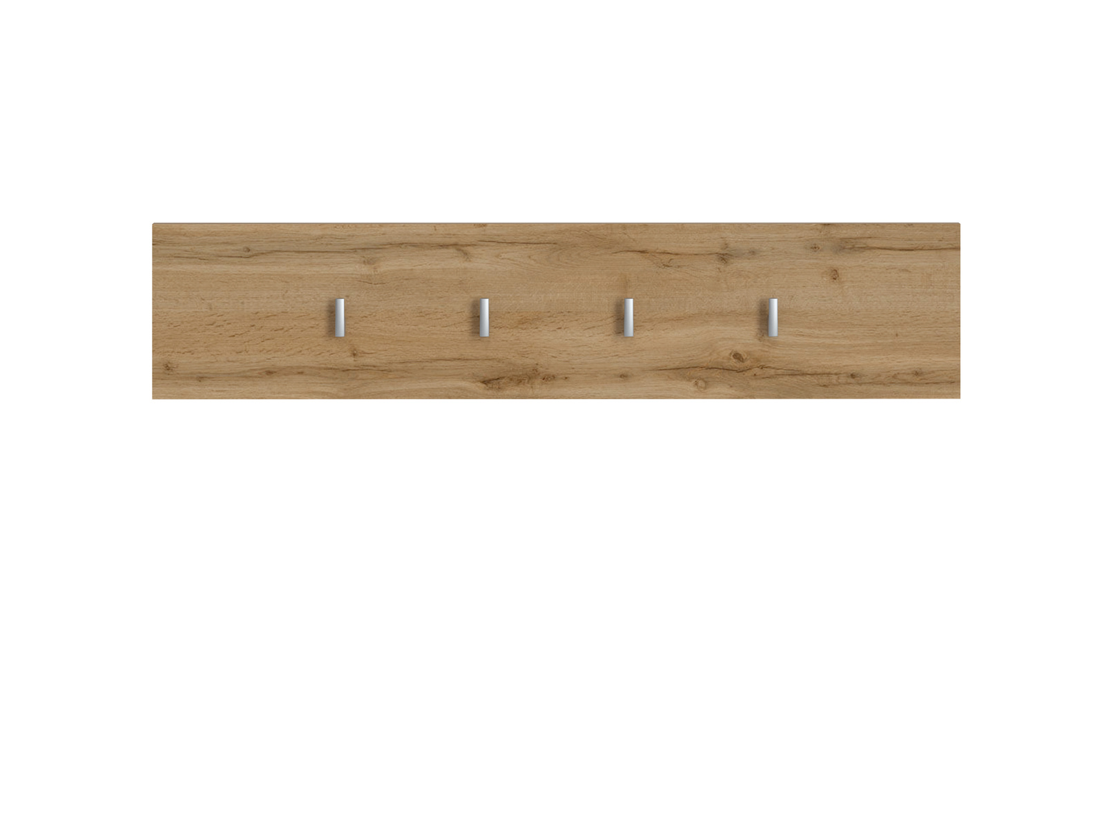 - Panel ścienny do której zamocowane są cztery haczyki/wieszaki zaskakuje funkcjonalnością. Solidnie wykonana półka ścienna do samodzielnego montażu powstała z płyty wiórowej laminowanej w odcieniu Dąb Wotan. Łatwo utrzymać ją w czystości i dopasować do pozostałych mebli z kolekcji. Wieszaki wykonano z tworzywa sztucznego. Prezentujące minimalistyczną stylistykę wieszaki posłużą do utrzymania ciężaru okryć wierzchnich całej rodziny, torebek i niewielkich plecaków.