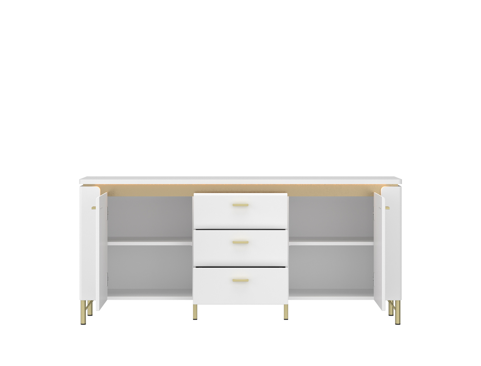 Komoda RTV, prezentowana w ramach kolekcji Lazio jest pojemnym, funkcjonalnym meblem, wpisującym się w przemyślane aranżacje strefy dziennej. Wykonana z płyty laminowanej wiórowej i MDF komoda prezentuje nowoczesne, eleganckie zestawienie bieli z elementami w kolorze złota (zastosowano odcienie Biała Alpejska, Biały Połysk i Złoto). Całość dopełniają stylowe, dodające ponadczasowego luksusu uchwyty i wysokie nóżki, powstałe z metalu, malowane na odcień złoty.