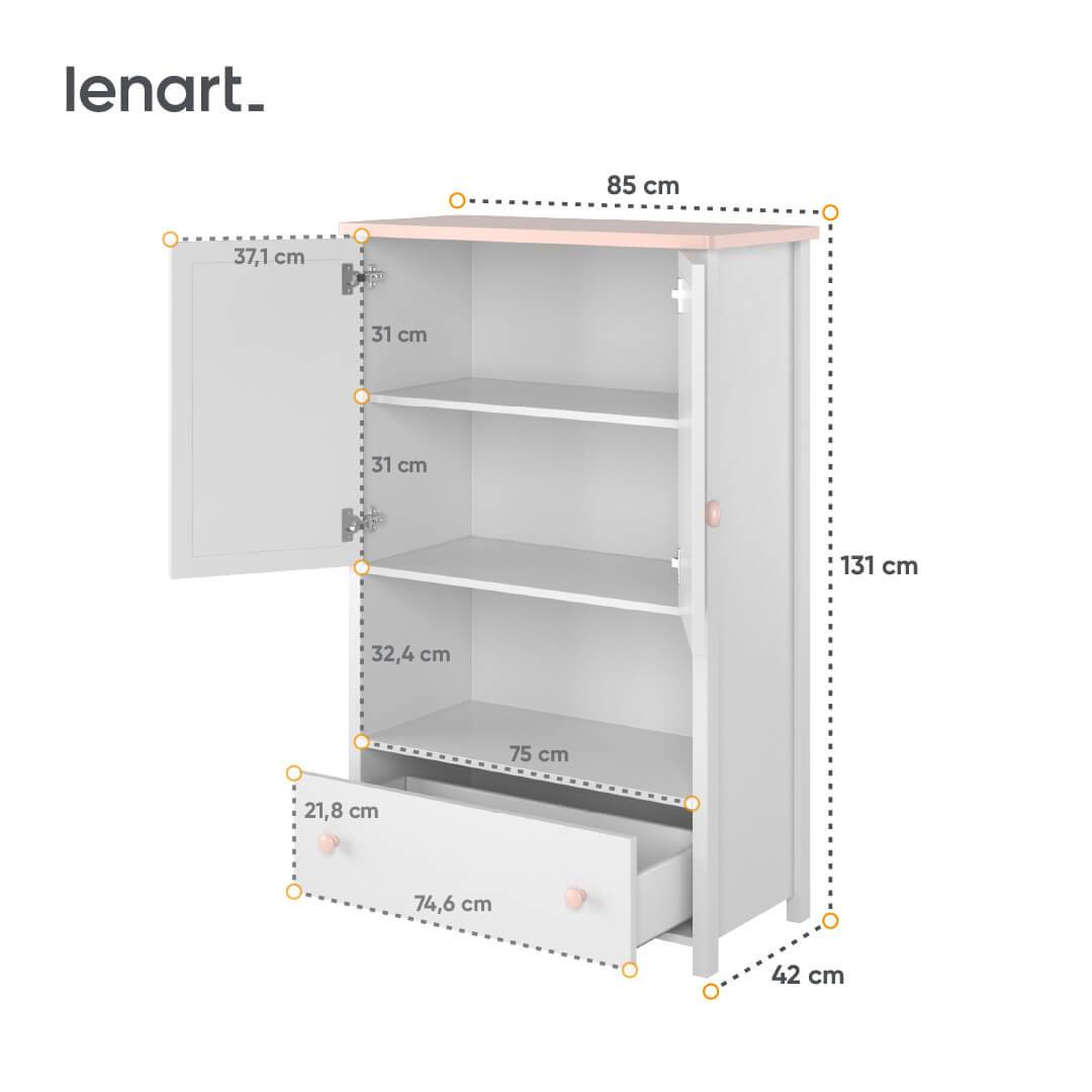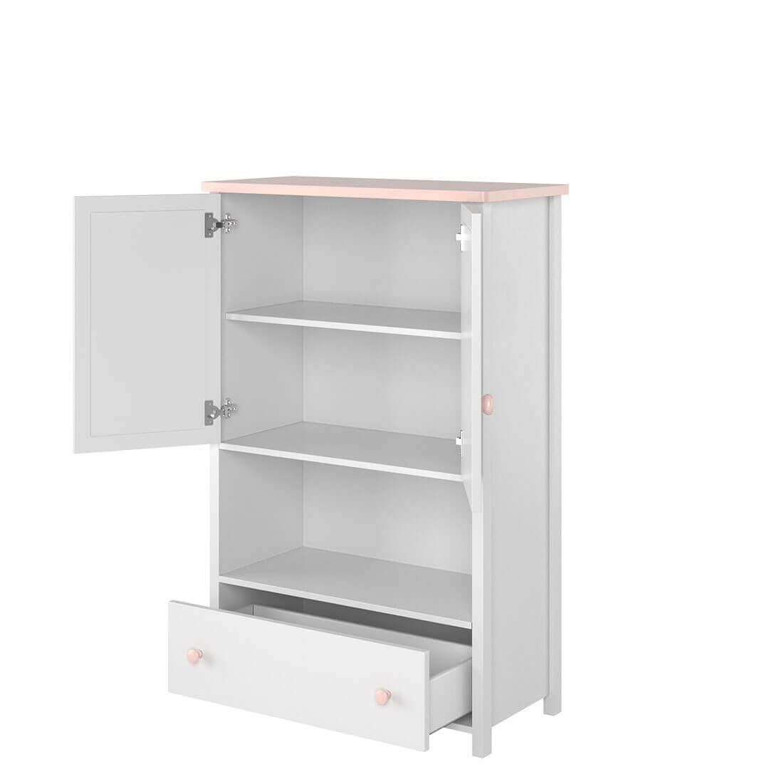 Stylowa komoda z dwojgiem drzwi, półką na książki lub dekoracje oraz pojemną i łatwo dostępną szufladą na bieliznę lub drobiazgi.