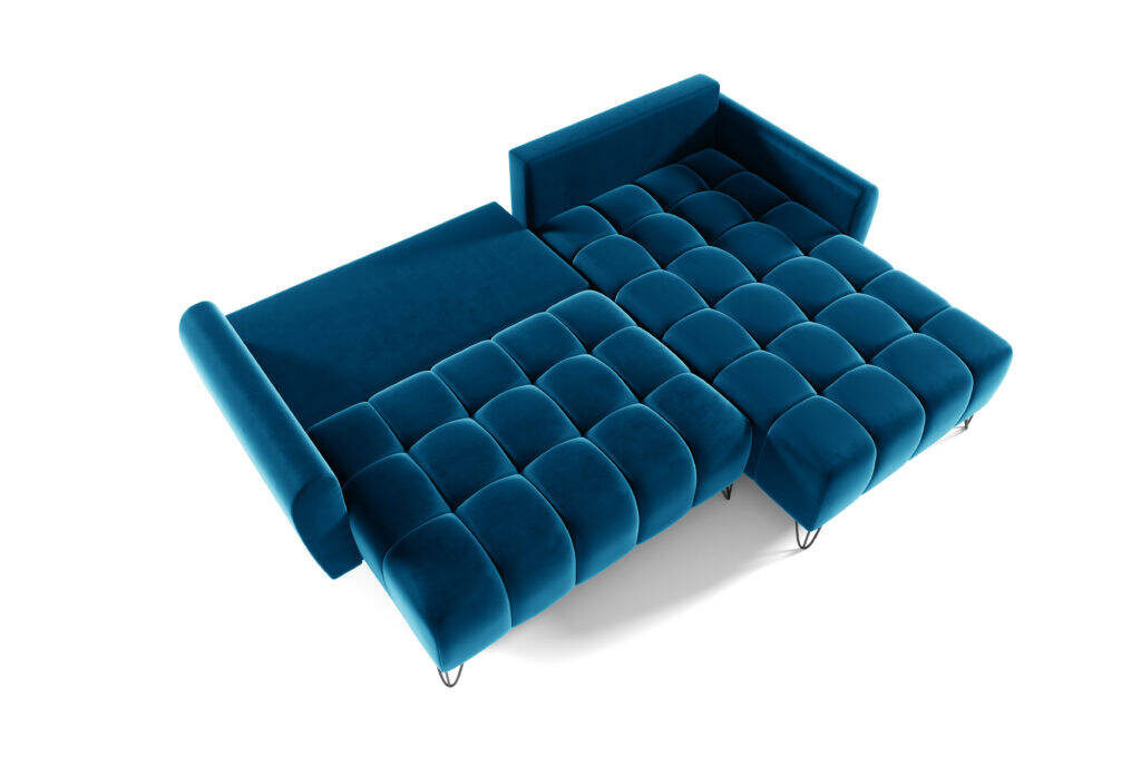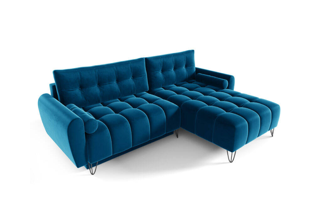 Narożnik Manhattan to nowoczesny mebel, który przyciąga uwagę eleganckim wzorem. Doskonale pasuje do salonu, pokoju młodzieżowego czy gościnnego, dodając wnętrzom klasy. Jego przestronność i wykończenie miękkim pluszem zapewniają wysoki komfort użytkowania. Narożnik wyposażony jest w pojemnik na pościel i system rozkładania DL. Industrialne metalowe nogi podkreślają nowoczesny styl. Dwie duże poduszki pikowane guzikami i dwie małe w kształcie wałków zapewniają dodatkową wygodę.