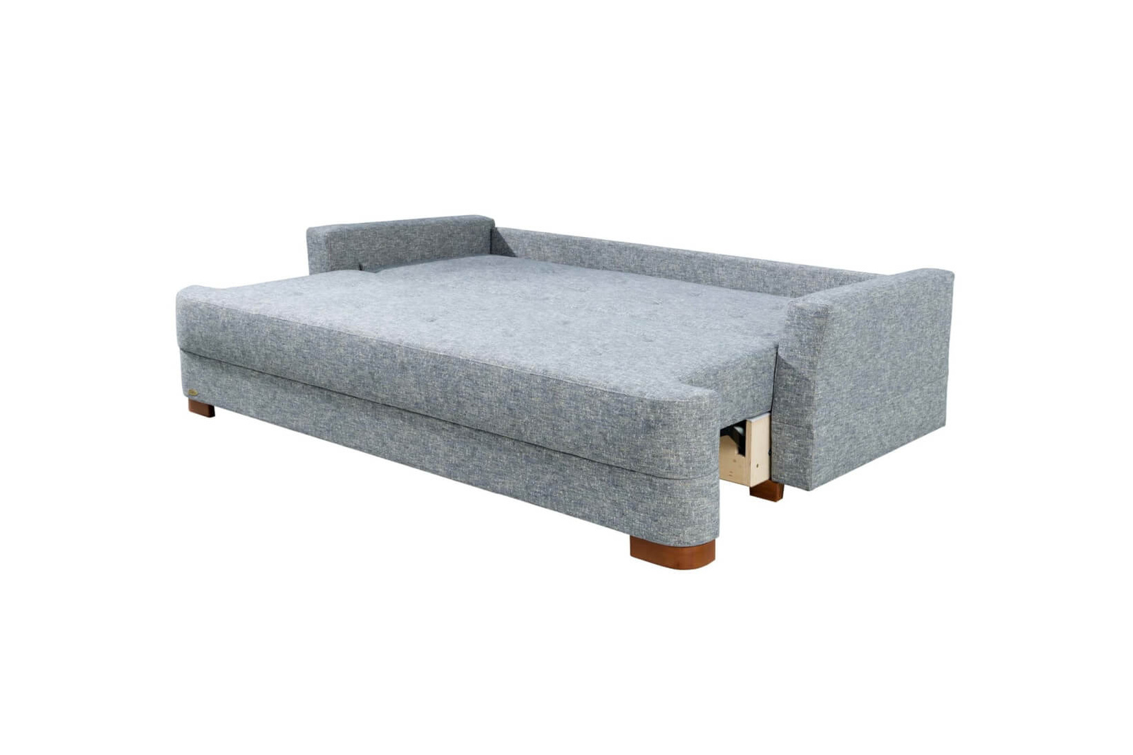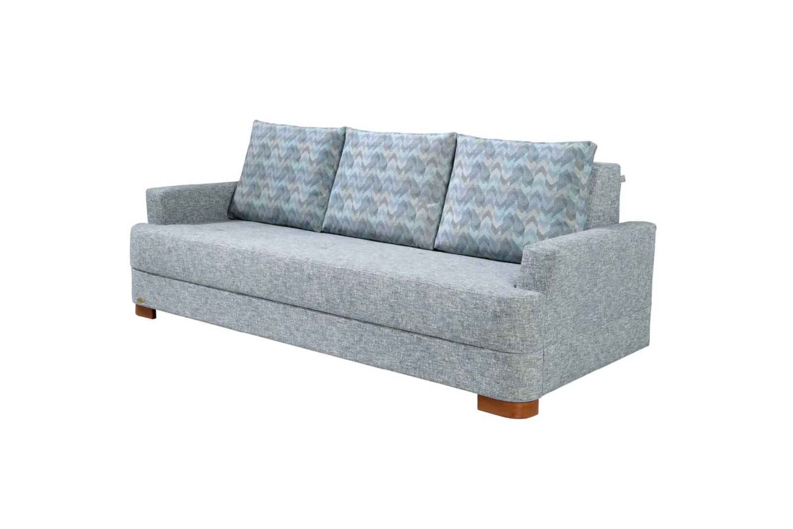 Kanapa MAX XIX [3 KN.PJ]. Posiada funkcję spania i pojemnik na pościel. Poduszki oparciowe mogą być wykonane z innego materiału aniżeli podstawa mebla. Elementy drewniane dostępne w kolorach ze wzornika wybarwień UNIMEBEL. Produkt dostępny w pełnej ofercie tkanin UNIMEBEL.