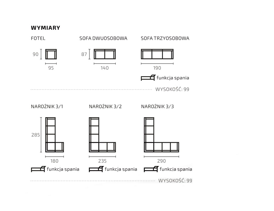 - W skład zestawu podstawowego wchodzi: Sofa 3 osobowa nierozkładana + 2 fotele w tkaninie z grupy 1. Istnieje możliwość konfiguracji zestawu, w tym celu należy w konfiguratorze wybrać elementy, które zastąpią elementy z zestawu podstawowego.