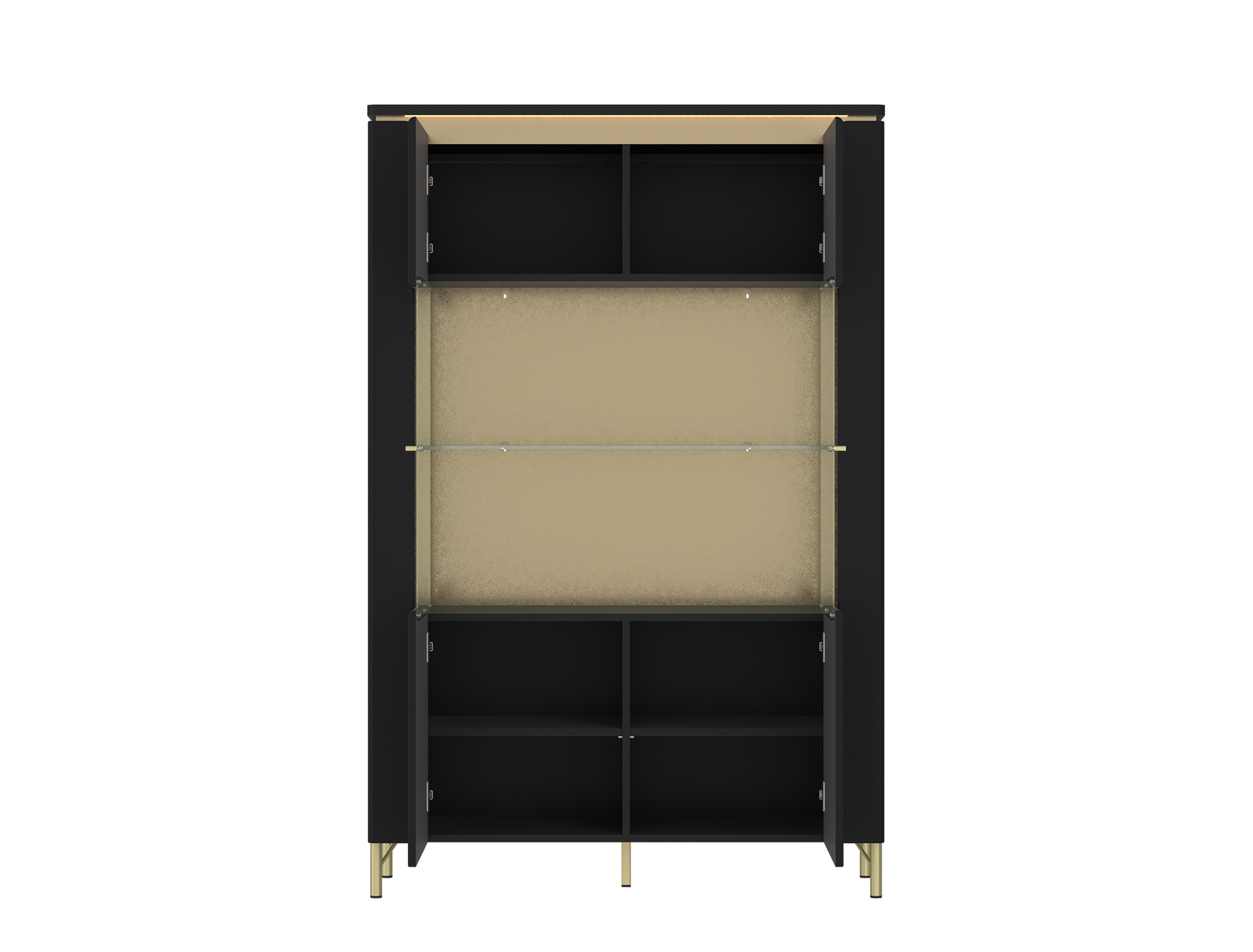 Dwudrzwiowa witryna Norica powstała z MDF oraz płyty wiórowej laminowanej w elegancko prezentującym się zestawieniu kolorystycznym Czarny Mat oraz Złoto. Mebel posiada częściowo przeszklone fronty drzwiowe, wykonane ze szkła hartowanego. Ich luksusowy charakter podkreślają nowocześnie prezentujące się, metalowe uchwyty w odcieniu złota, wykonane w tym samym stylu, co wysokie nóżki witryny. Bryła wyposażona została w oświetlenie konstrukcyjne (Pasek LED TREND) z możliwością doposażenia w oświetlenie jednopunktowe Square lub Prismatic Mini Trend. Szklane półki witryny nie są hartowane. Dla frontów drzwiowych zastosowano zawiasy z cichym domykiem.