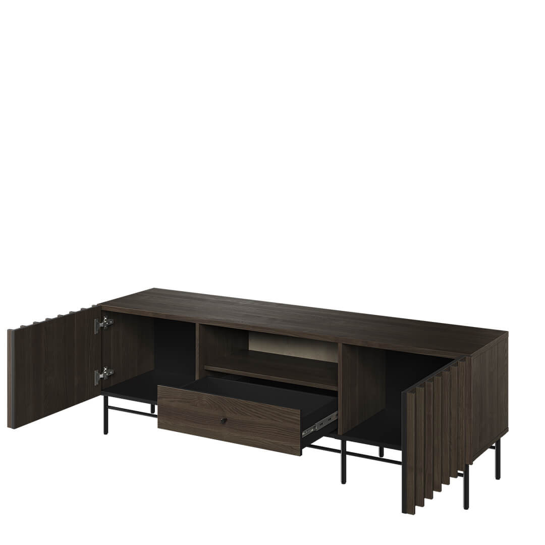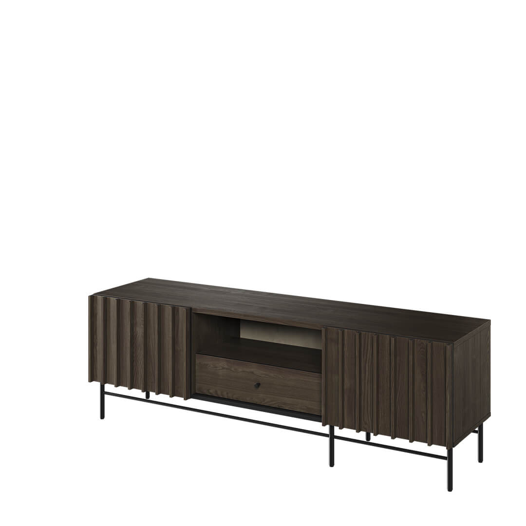 Nowoczesna komoda RTV to mebel, którego nie może zabraknąć podczas urządzania modnej strefy relaksu w salonie. Posiada wnękę, szafki i szufladę.