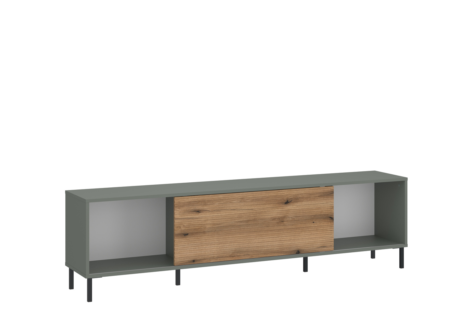 Przesuwny front ryflowany zachwyca funkcjonalnością, a także szlachetną, wyczuwalną i widoczną strukturą naturalnego drewna. Kolor Dąb Coast Evoke frontu doskonale łączy się z odcieniem szarozielonym, zastosowanym dla korpusu i półek. Pojemność przechowywania, prostota kształtu oraz stylowe zestawienie kolorystyczne sprawiają, że prezentowana komoda RTV znajdzie zastosowanie w licznych stylach aranżacyjnych.