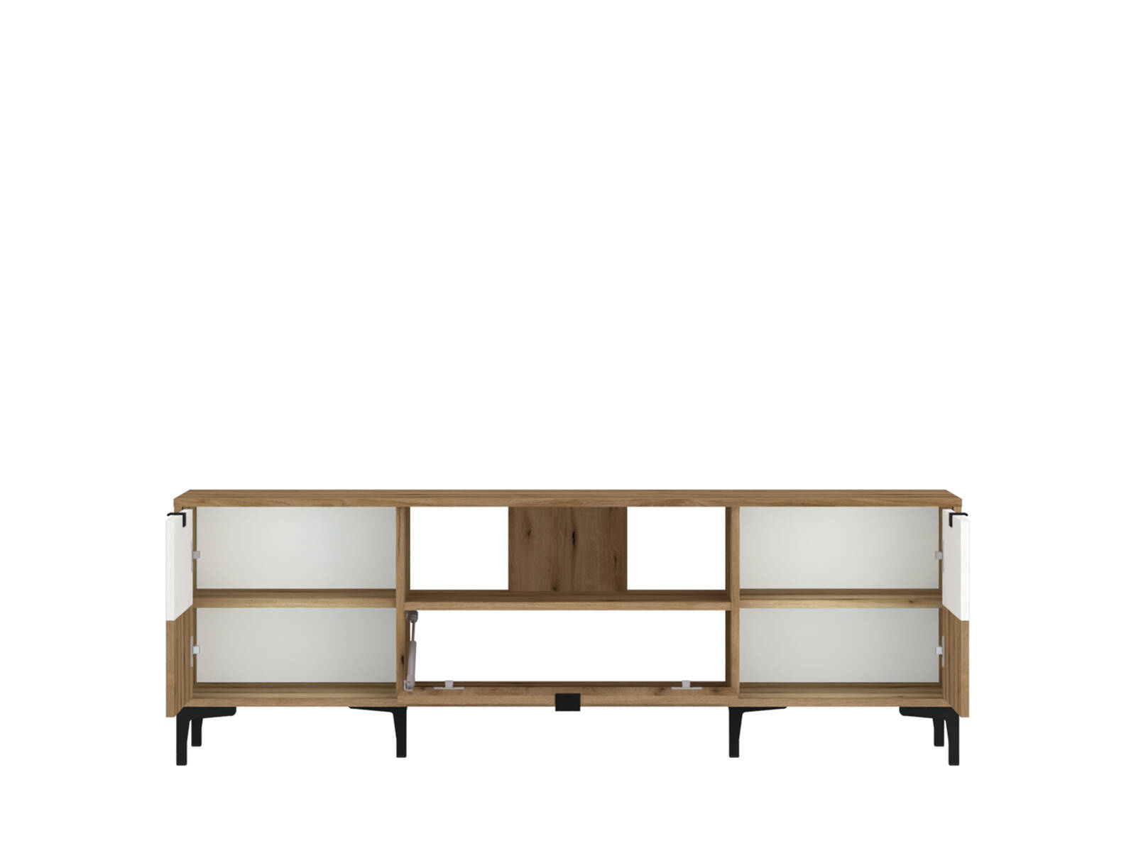 - Komoda RTV Ricko z dwojgiem drzwi i zamkniętą półką pomieści sprzęt RTV, który chcesz wyeksponować oraz elementy, mające znaleźć się za pełnymi frontami drzwiowymi. Zaaranżujesz z nią pomieszczenie, urządzone nowocześnie, industrialnie, w stylu skandynawskim, boho lub eklektycznym.