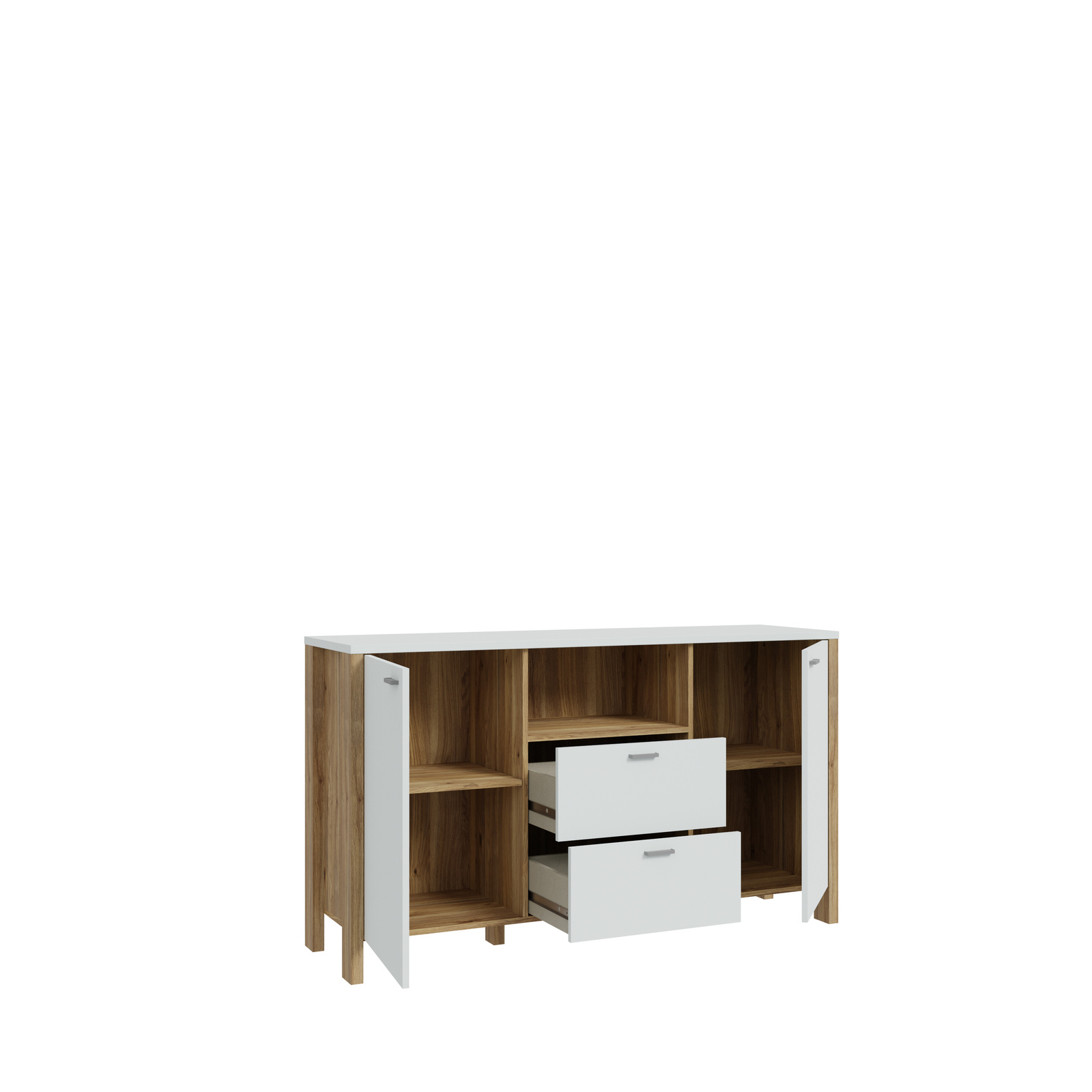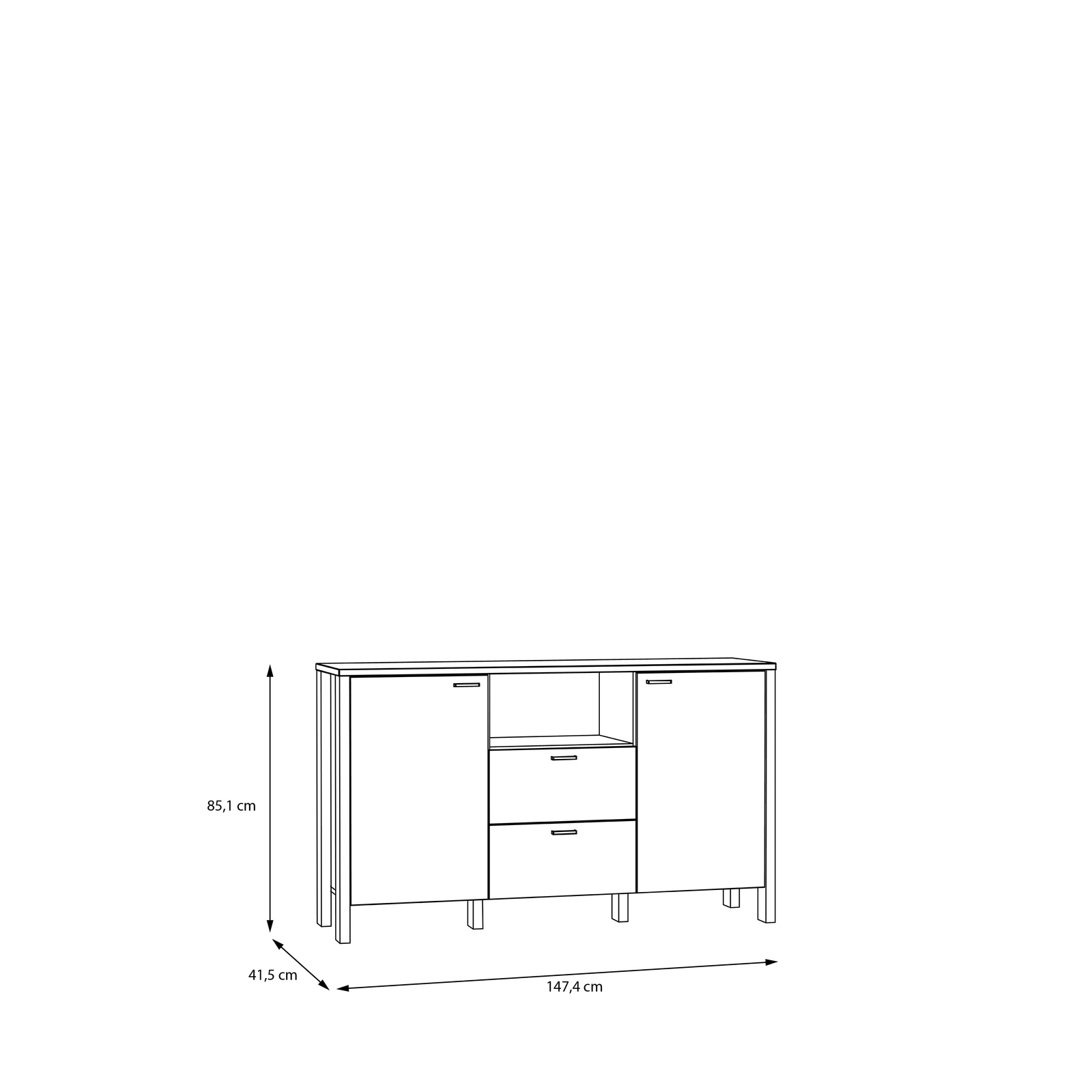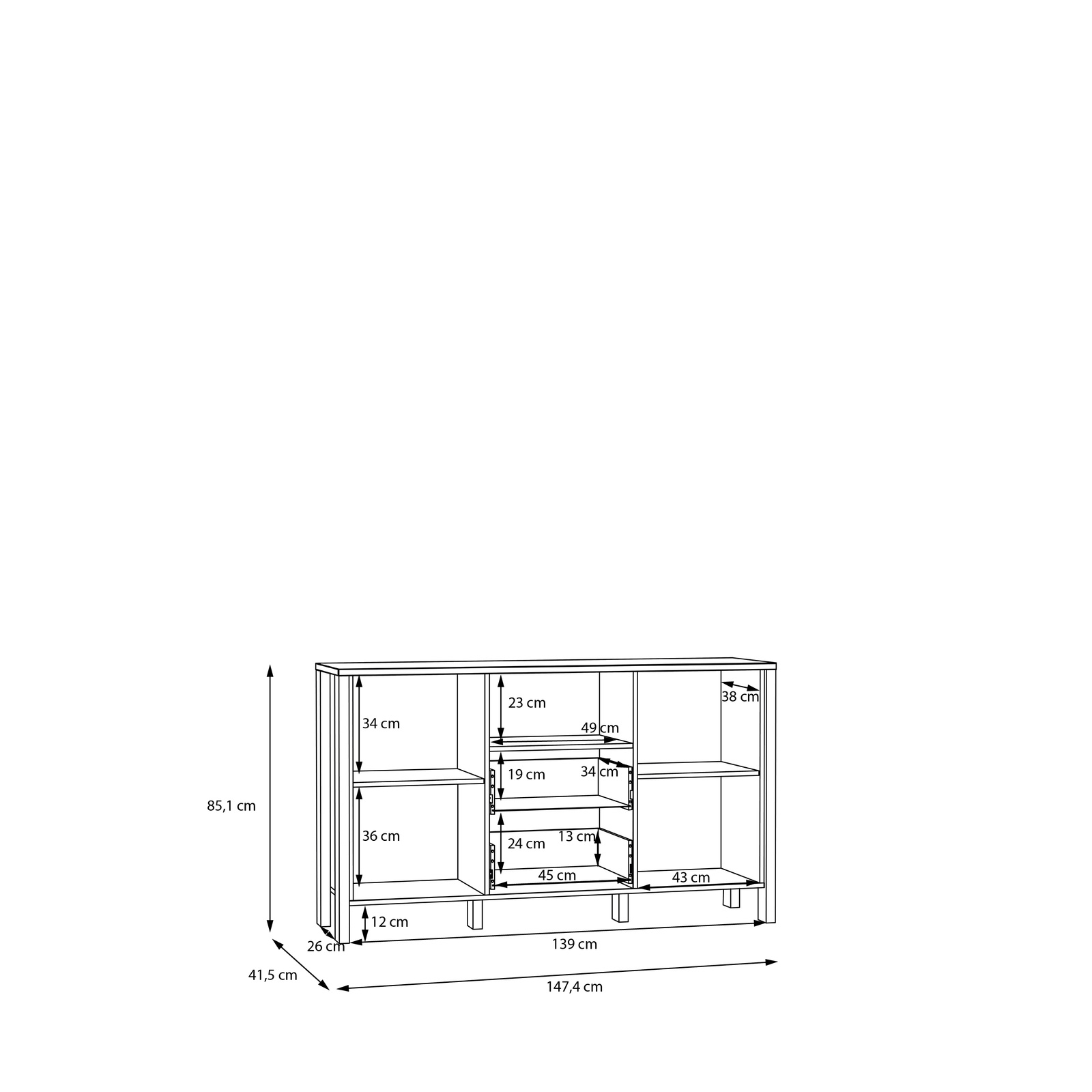• Mebel o wymiarach: szerokość 146,4 cm x wysokość 86,5 cm x głębokość 41,6 cm, z różnymi opcjami przechowywania