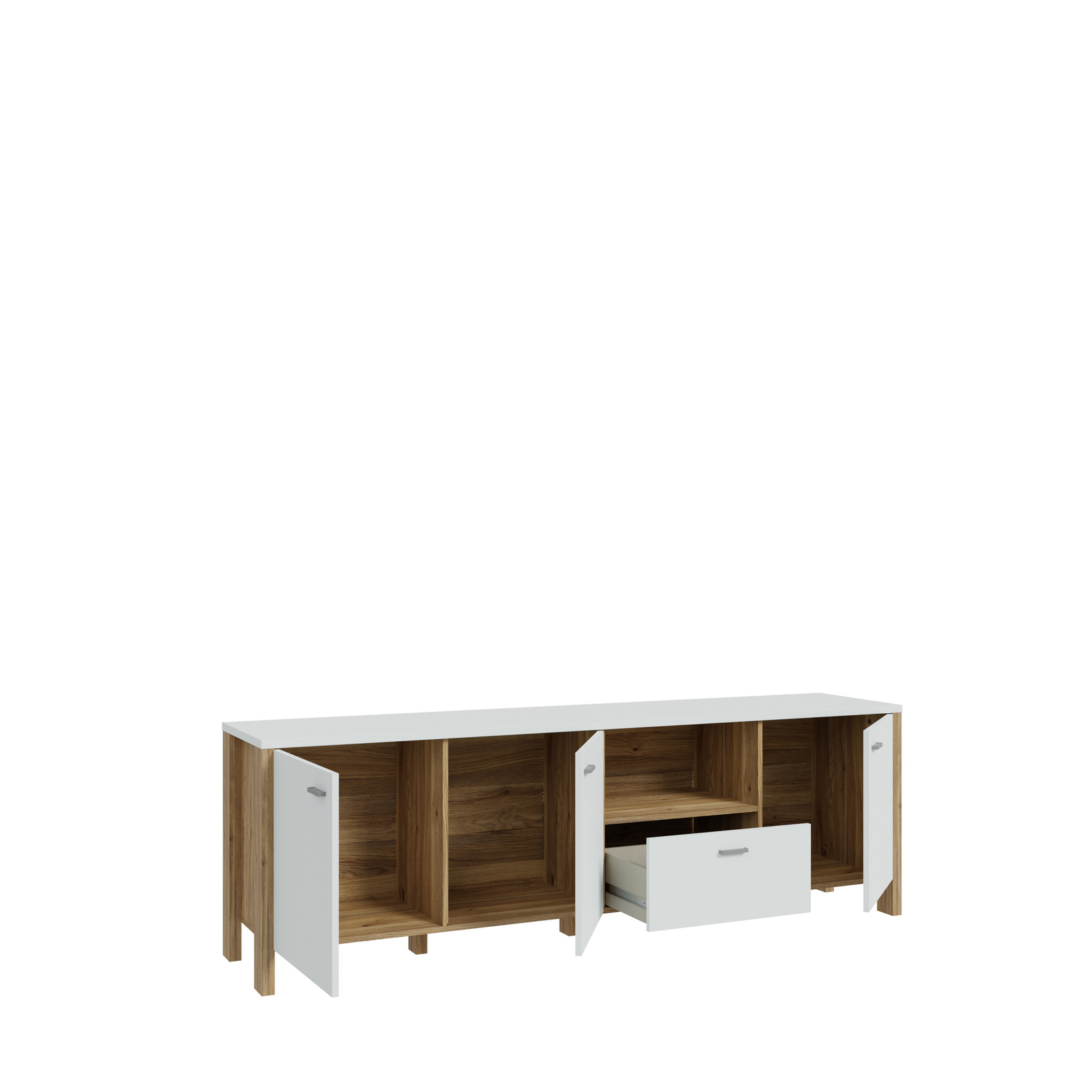 Szafka RTV SAITAMA to obowiązkowe wyposażenie salonu każdego kinomana. Jej konstrukcja i detale sprawiają, że będzie świetnie wyglądać w pomieszczeniu urządzonym w stylu loftowym. Na blacie możesz ustawić telewizor o przekątnej ekranu do 70 cali. Szuflada, 3 szafki, 4 wnęki i 1 półka z płyty zapewnią sporo miejsca na przechowywanie płyt CD, DVD oraz dekodera. Szafkę RTV połącz z pozostałymi elementami kolekcji SAITAMA i stwórz wymarzony salon.