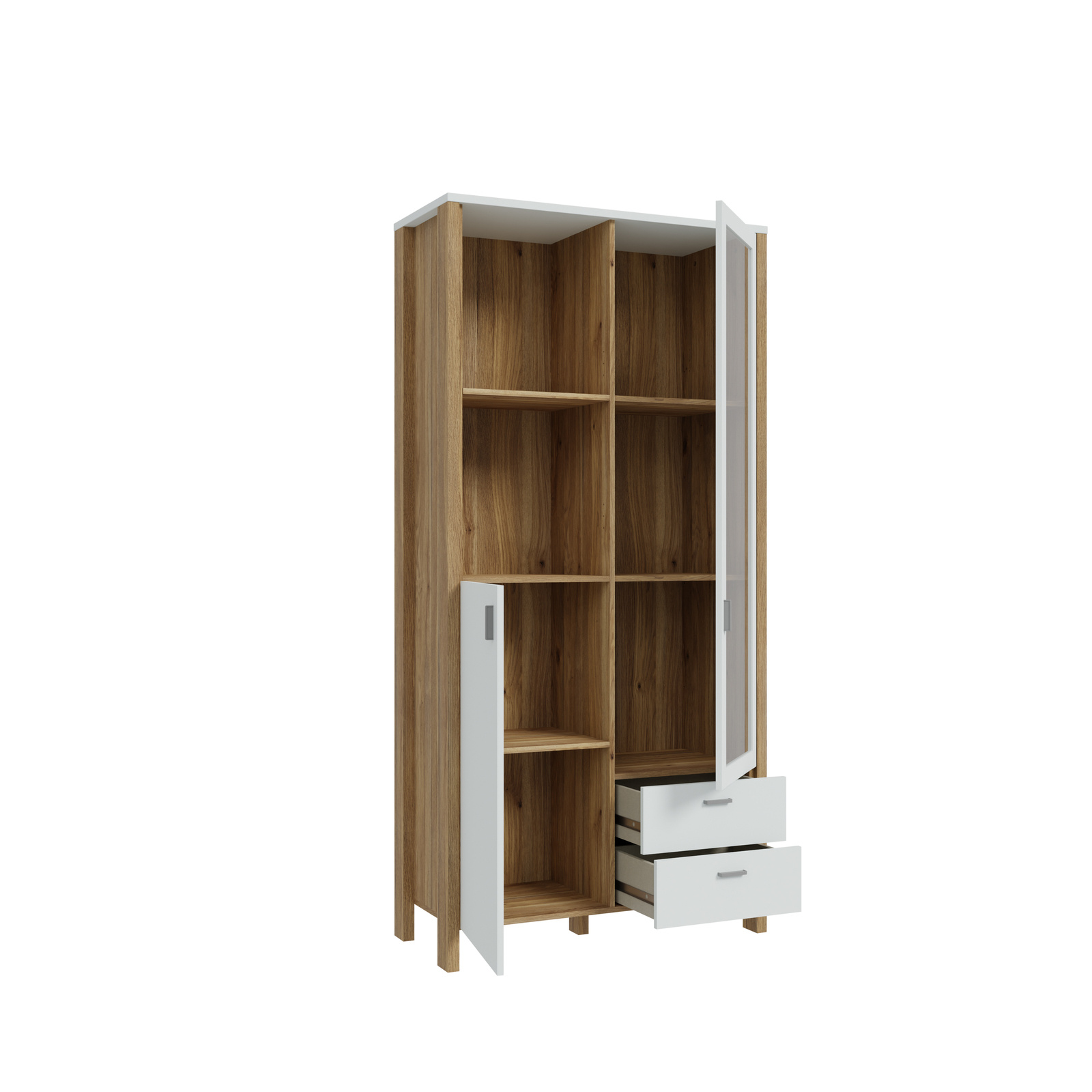 Witryna z kolekcji SAITAMA świetnie wyeksponuje Twoje ulubione książki, pamiątki oraz dekoracje. W przechowywaniu drobiazgów lub dokumentów sprawdzą się 2 szuflady osadzone na prowadnicach kulkowych. Witryna doskonale wygląda zestawiona z pozostałymi elementami z kolekcji, tworząc wymarzoną aranżację salonu.