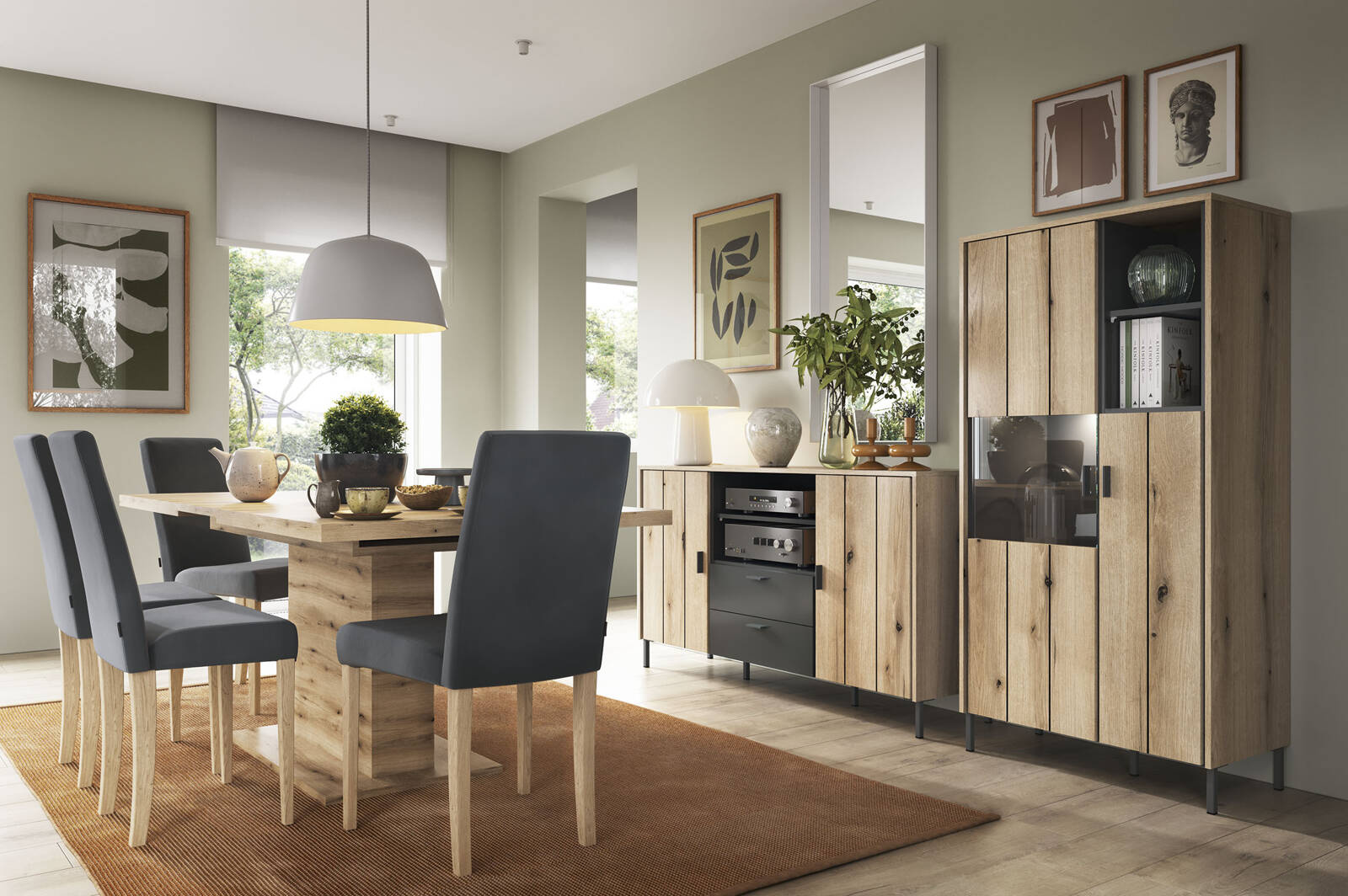 Prostota kształtu, odcień naturalnego drewna, elementy antracytowe, minimalistyczne uchwyty i dodające wyjątkowego efektu, metalowe, wysokie nóżki sprawiają, że kolekcja Shirley Dąb zachwyca uniwersalnością zastosowania. Przeznaczone do salonu i jadalni bryły zachwycają pojemnością przechowywania, ergonomią rozkładu półek i szuflad oraz komfortem w codziennym użytkowaniu. Kolekcja znajduje zastosowanie w pomieszczeniach, urządzonych m. in w stylu industrialnym, vintage, eklektycznym i boho.