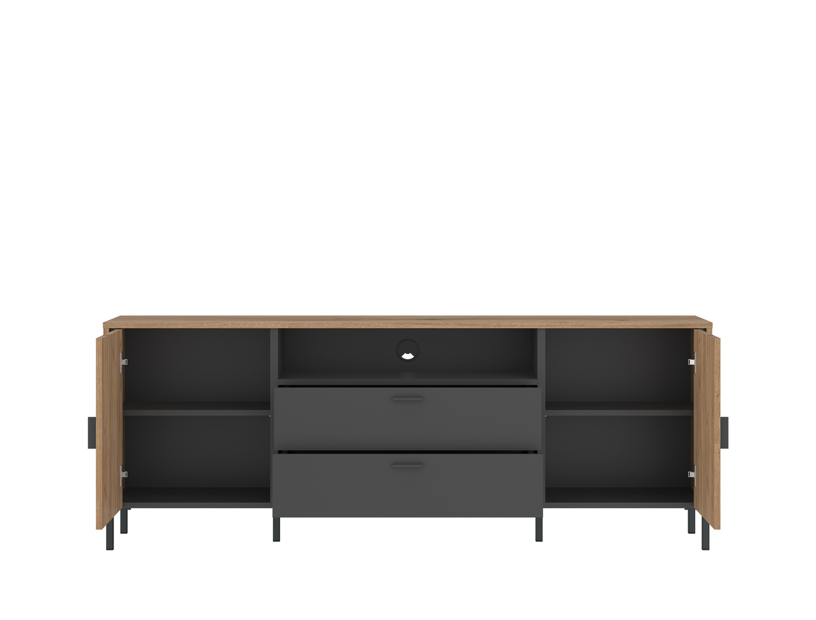 Komoda RTV Shirley Dąb powstała z płyty wiórowej laminowanej oraz płyty MDF w kolorystyce naturalnego dębu (Dąb Coast Evoke) oraz antracytu. Zestawienie tych kolorów, obecnych w korpusie i na frontach mebla doskonale komponuje się z uchwytami oraz metalowymi nóżkami. Funkcjonalny mebel posiada szuflady na kulkowych prowadnicach, pozwalających na pełny wysuw, fronty drzwiowe, wyposażone w zawiasy z cichym domykiem, a także otwartą półkę, zwiększającą funkcjonalność.