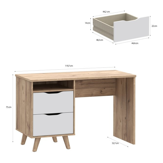 Wymiary biurka: szerokość 119,7 cm, wysokość 75 cm, głębokość 52,7 cm