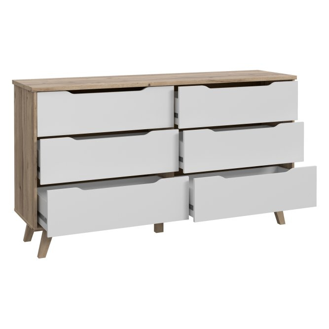 Niezwykle nowoczesna komoda w połączeniu dekorów Deski Dębowej oraz Białego jest w stanie zapewnić mnóstwo miejsca do przechowywania. Dekor imitujący drewno w połączeniu z bielą idealnie wkomponuje się do każdego pomieszczenia. Znakomicie sprawdzi się w salonie, sypialni, pokoju nastolatka lub przedpokoju.