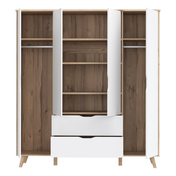 Przestronna szafa ubraniowa VANKKA o wymiarach 184,1 cm szerokości, 201,5 cm wysokości i 52,7 cm głębokości to idealne rozwiązanie dla każdego, kto ceni sobie porządek i estetykę.   Wykonana w charakterystycznym stylu kolekcji VANKKA, łączy piękny dekor dębowej deski z elegancką bielą, co nadaje jej nowoczesny i przytulny wygląd. Charakterystyczne drewniane nóżki dodają meblowi lekkości i elegancji. VANKKA łączy w sobie nowoczesny design i funkcjonalność, idealnie wpasowując się w różnorodne aranżacje wnętrz. Szafa to doskonały wybór do sypialni, garderoby, a także do biura czy przedpokoju – pasuje zarówno do mniejszych, jak i większych pomieszczeń. Wyposażona jest w drążki na wieszaki, półki oraz dwie praktyczne szuflady zapewniając dużą przestrzeń do przechowywania ubrań i akcesoriów.