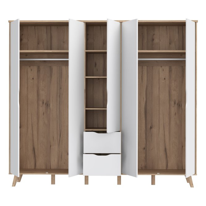 Szafa ubraniowa VANKKA o wymiarach 228,8 cm szerokości, 201,5 cm wysokości i 52,7 cm głębokości to idealne rozwiązanie dla każdego, kto ceni sobie porządek i estetykę.   Wykonana w charakterystycznym stylu kolekcji VANKKA, łączy piękny dekor dębowej deski z elegancką bielą, co nadaje jej nowoczesny i przytulny wygląd. Charakterystyczne drewniane nóżki dodają meblowi lekkości i elegancji. VANKKA łączy w sobie nowoczesny design i funkcjonalność, idealnie wpasowując się w różnorodne aranżacje wnętrz.